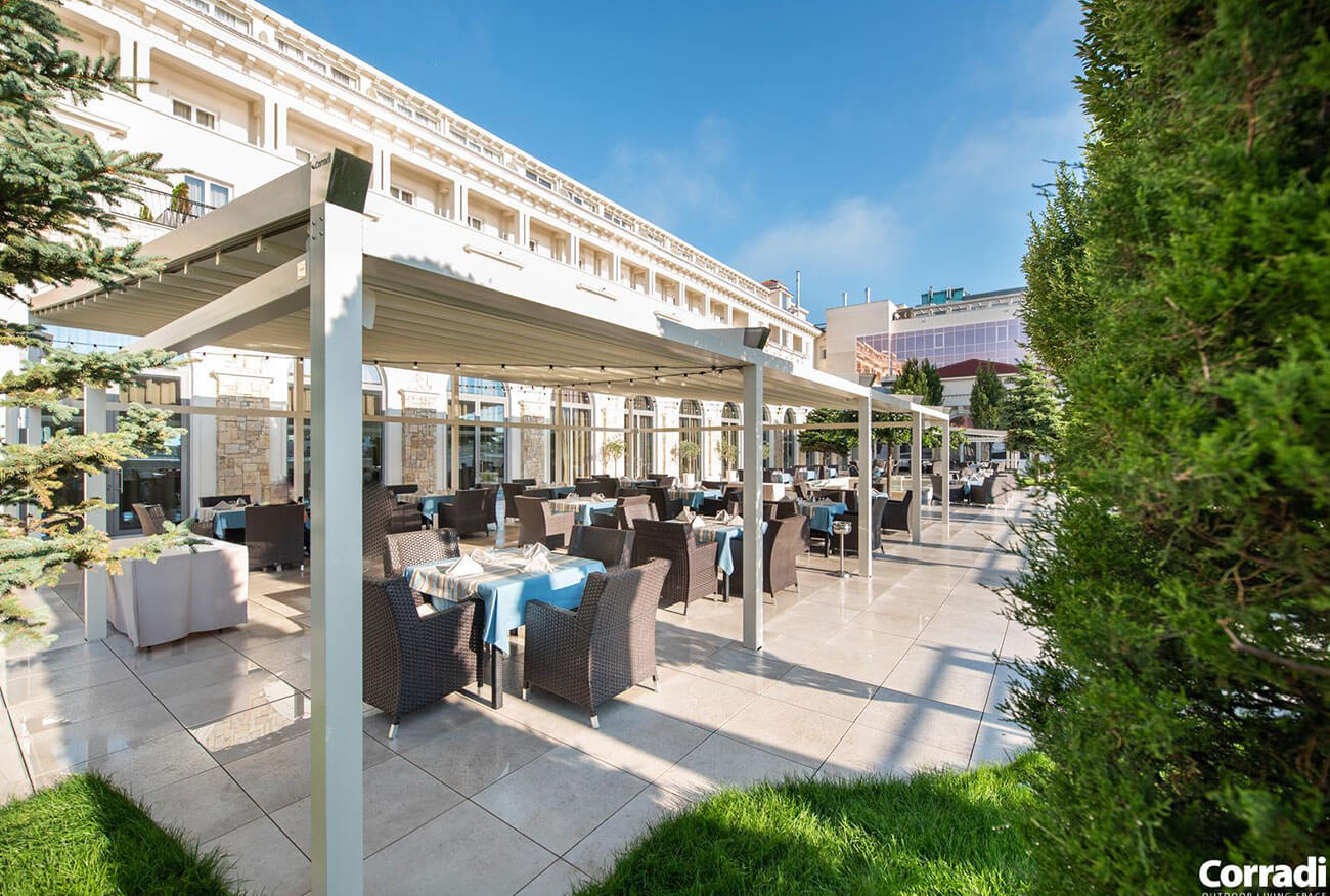 Durch Funktionen und Erweiterungen wie integrierter Entwässerungen in den Stützen, direkter und indirekter Beleuchtung am Tuch oder durch nachrüstbare Heizstrahler steht mit diesen Alleskönnern ausgelassenen Abenden mit Ihren Gästen auch im Winter nichts mehr im Wege. Integrierter senkrechter Sonnenschutz und Glasschiebewände bieten dabei Schutz vor Wind auch wenn das Dach geöffnet ist so dass man den blauen Himmel genießen kann. Somit sind Ihre Möglichkeiten sowie Ihre Aussicht schier grenzenlos.